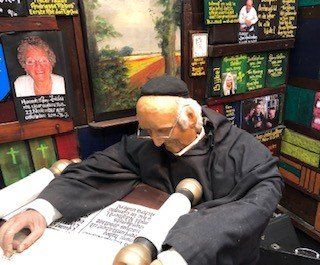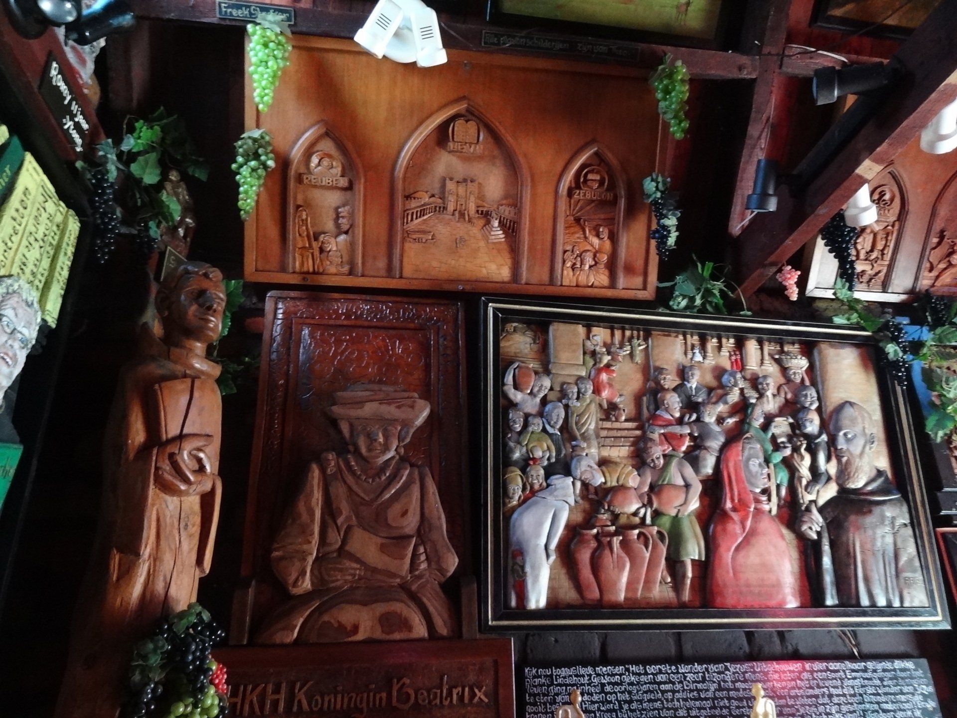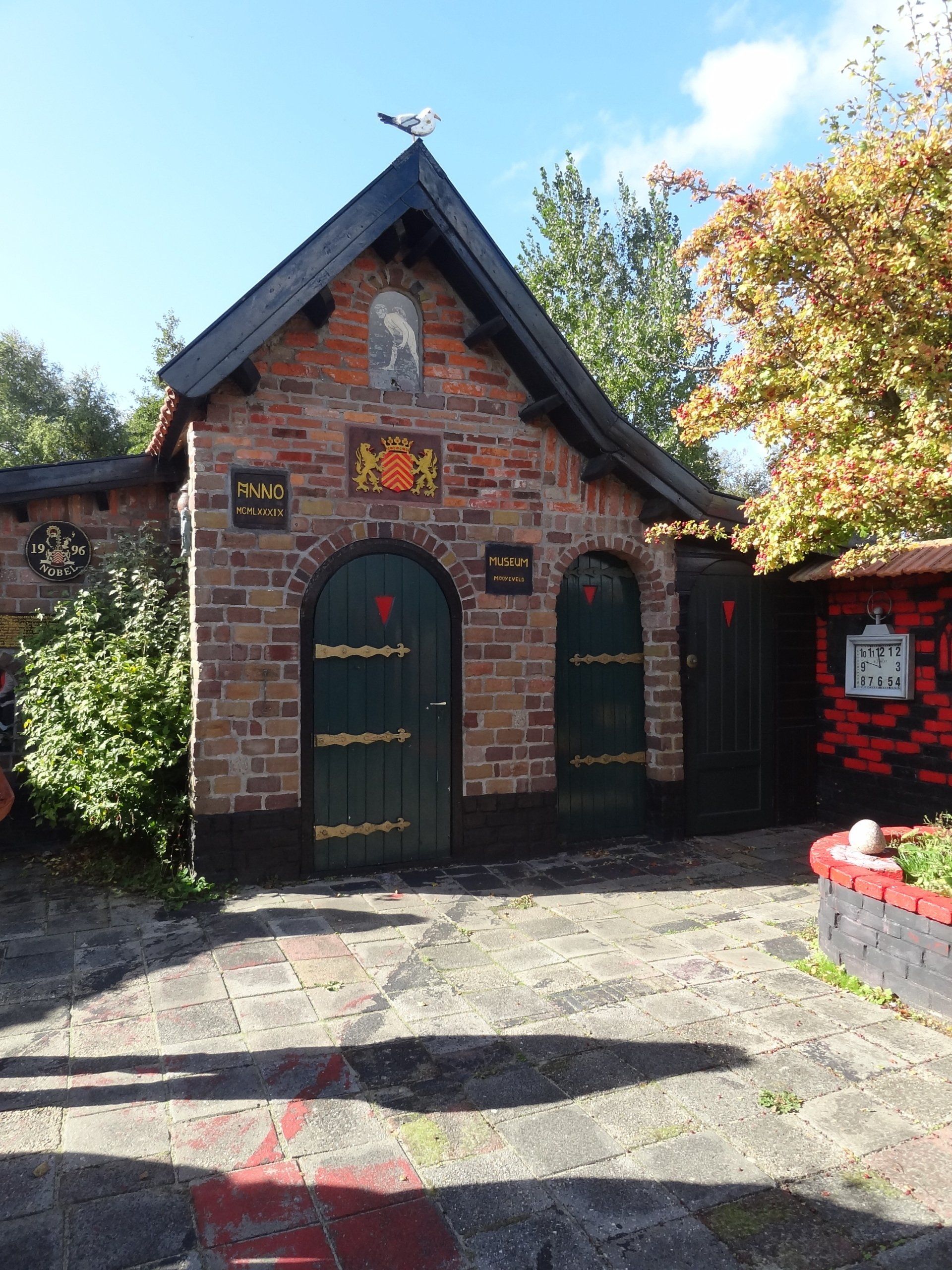 Helaas waren er door ziekte en om andere redenen toch nog een paar afzeggingen. Vrijdagmiddag had de feestcommissie het atelier omgetoverd in een feestatelier, maar eerst stond de excursie naar Afie’s Nobelhuis op het programma. Een verrassende entree. Nog een hobbelig weggetje tussen de landerijen door en wij konden de auto’s stallen op het privédomein van Afie. Allemaal geheimzinnige gebouwtjes waarin heel veel te zien en te lezen, en vooral ook te beluisteren was. Alle geheimen van Afie werden stuk voor stuk onthuld.